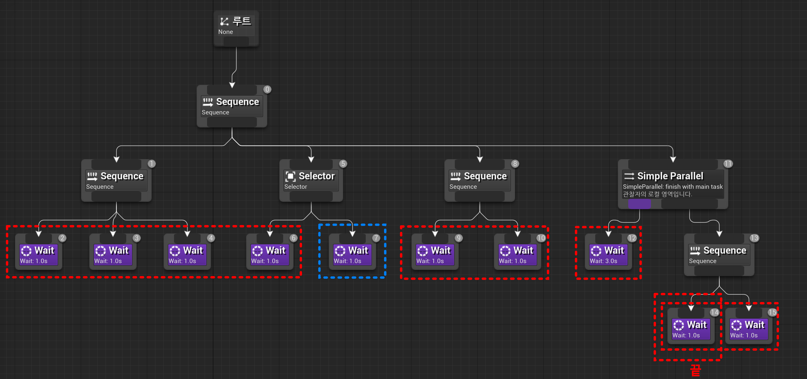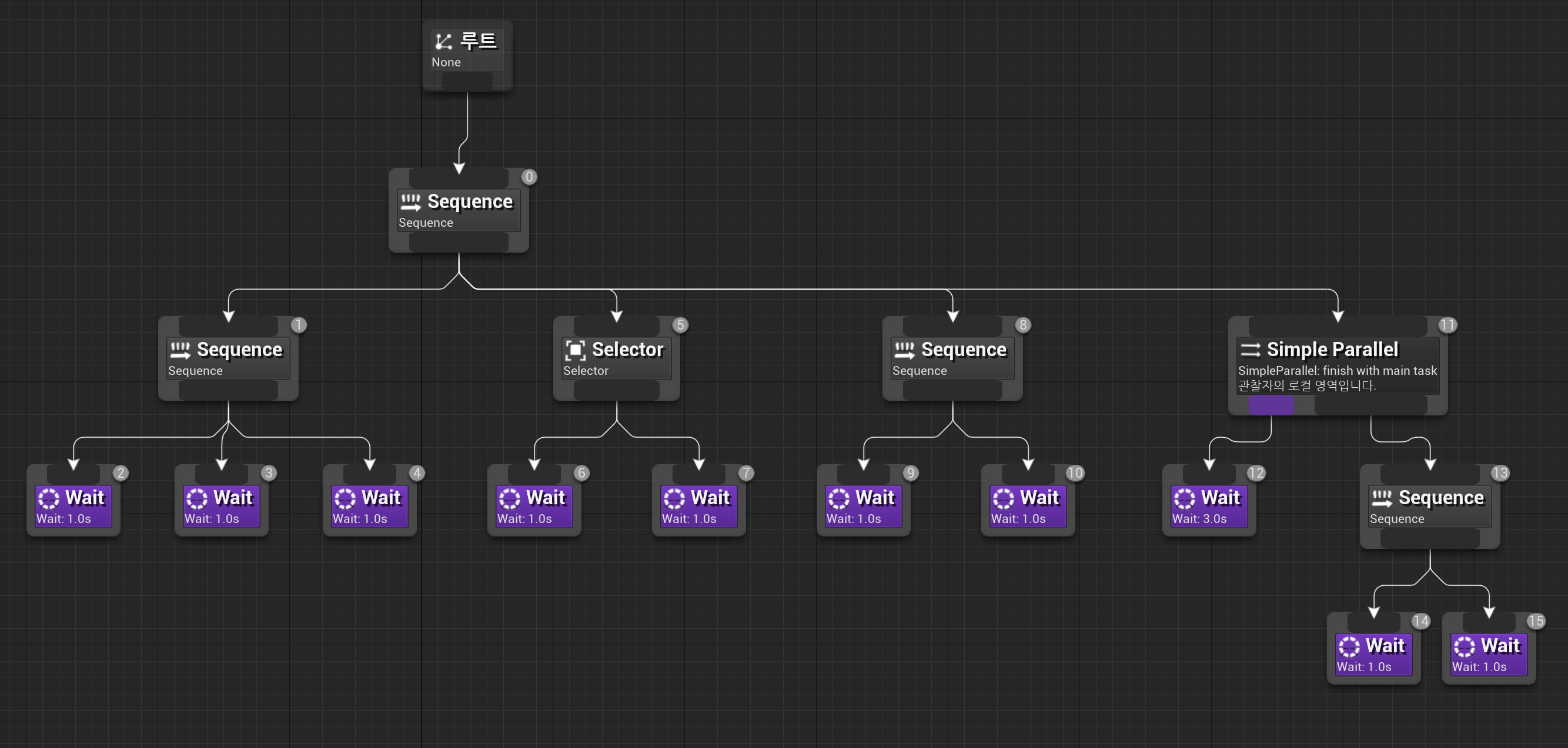 복합 노드: 이러한 노드는 동작 트리의 구조를 정의하며 하위 노드를 가질 수 있다. 언리얼 엔진에는 시퀀스와 셀렉터라는 두 가지 유형의 복합 노드가 있다. 시퀀스 노드는 하위 노드를 순서대로 실행하고, 셀렉터 노드는 성공할 때까지 하위 노드를 한 번에 하나씩 실행한다.